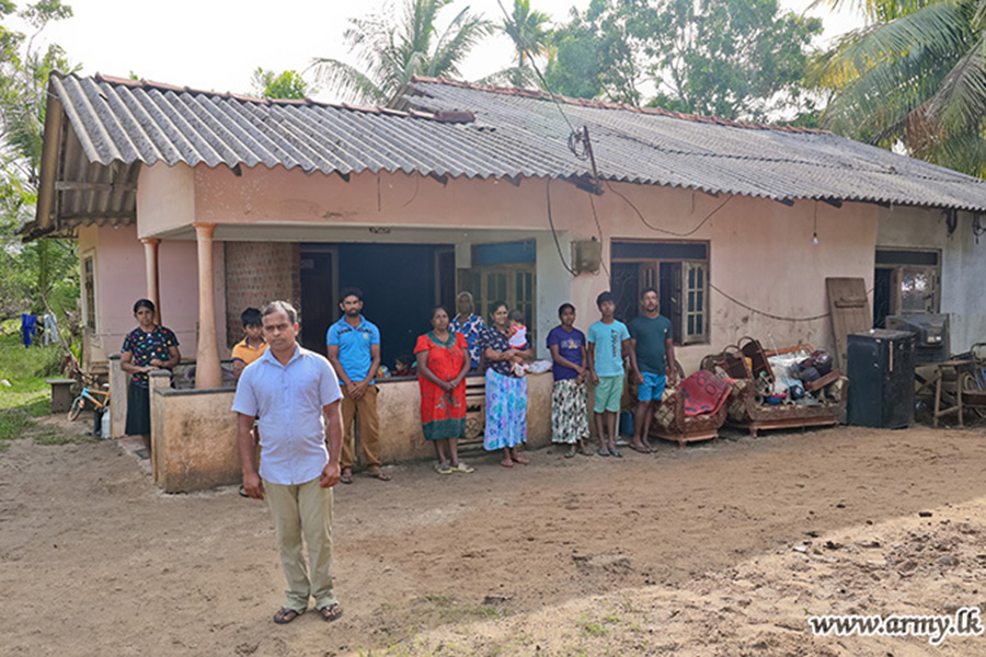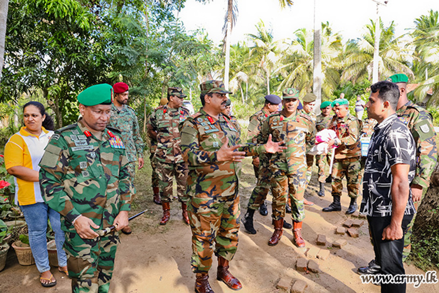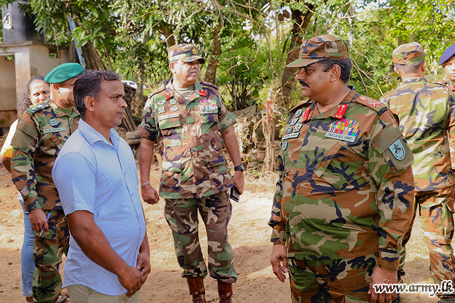 During the visit, the Army Chief inspected the homes of Bombardier W.A. Somasiri of the 15th Field Regiment, Sri Lanka Artillery, in Alivitiya, Kumarakattuwa, and Corporal P.K.K. Karunanayaka of the 1st Battalion, Vijayabahu Infantry Regiment, in Thukkiniyagama, Kumarakattuwa, Pallama. Dry rations were distributed to the affected families to provide immediate relief.
