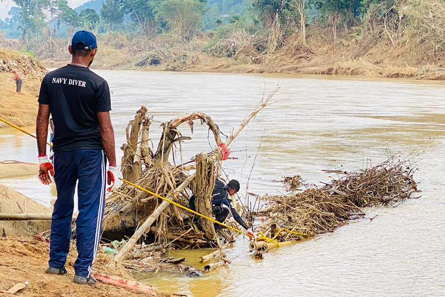 Similarly, the Kalugamuwa Bridge over the Mahaweli River in Nillamba became clogged with debris, creating an immediate risk to the main water pipeline supplying the National Water Supply and Drainage Board’s treatment plant from Gatambe. Accordingly a dedicated Navy diving and technical operation was launched, culminating in the removal of blockages by 14 December. This swift action eliminated the threat to the water supply infrastructure for the area.